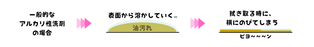 一般的なアルカリ性洗剤は、油と反応(けん化)しながら、表面からじわじわ内部へ進んでいきます。